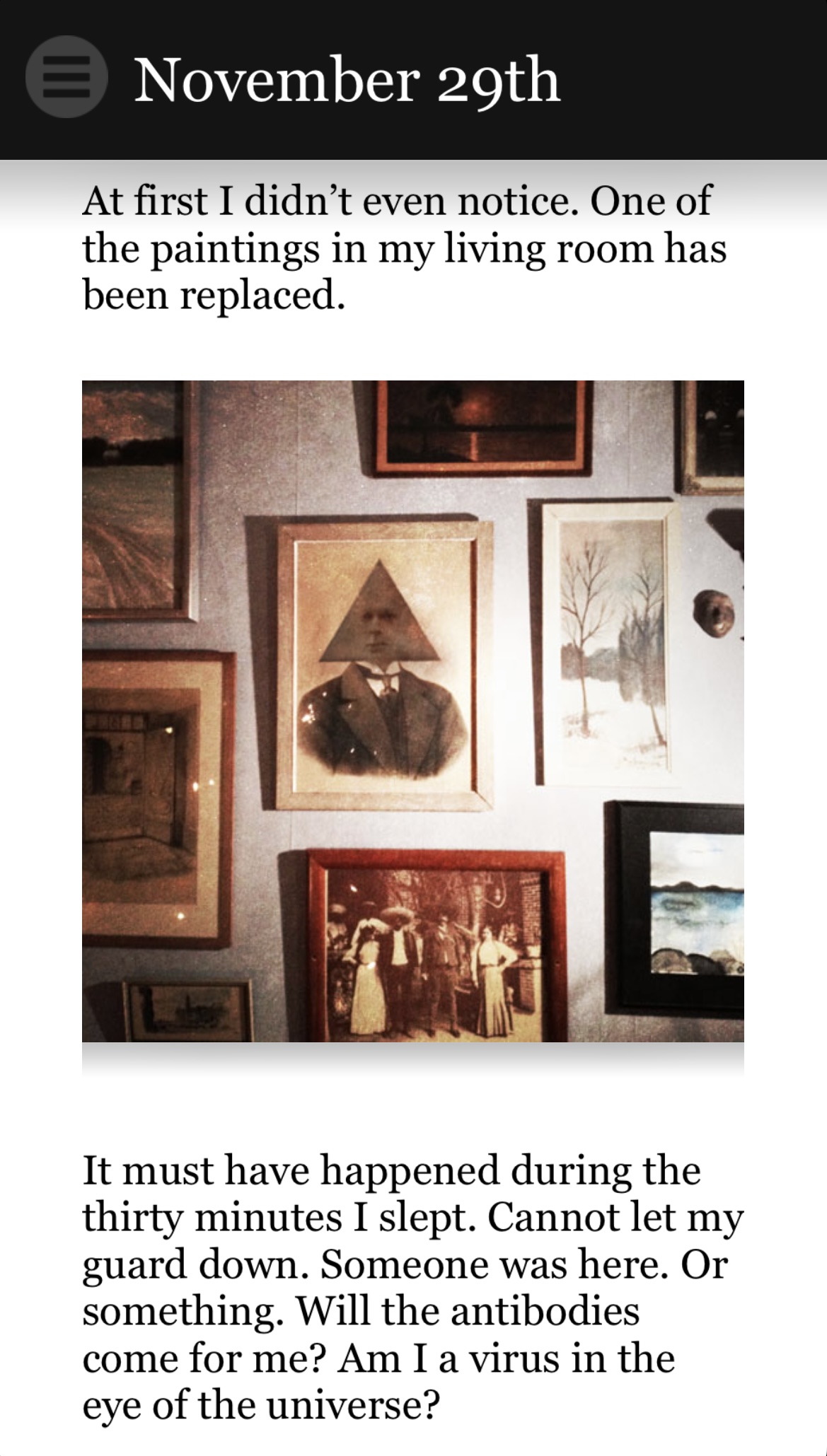 A somewhat underdeveloped thread in Year Walk concerns the idea that the year walk ritual causes a sort of “system error” in the universe: that it causes verisimilitude itself to crash. The game’s final resolution–its “true” ending–involves a connection between two characters: Daniel Svensson and Theodor Almsten. From more than a century in the future, Almsten entreats Svensson to appease the (evidently quite real) forest creatures’ bloodlust with his own life rather than an innocent girl’s, changing history. But this connection requires the intervention of a third figure: us. In order for Daniel to know the combination to the uncanny wooden box floating at a fixed point in space, Almsten must reveal his notes to us, through the medium of an iOS app. You may recall in this moment the immersion-breaking Myling puzzles, or that notion of a “system error” in the universe. Year Walk’s true ending emphasizes the softwareness of the software: a move that Simogo is still finding new ways to pull as of 2024.