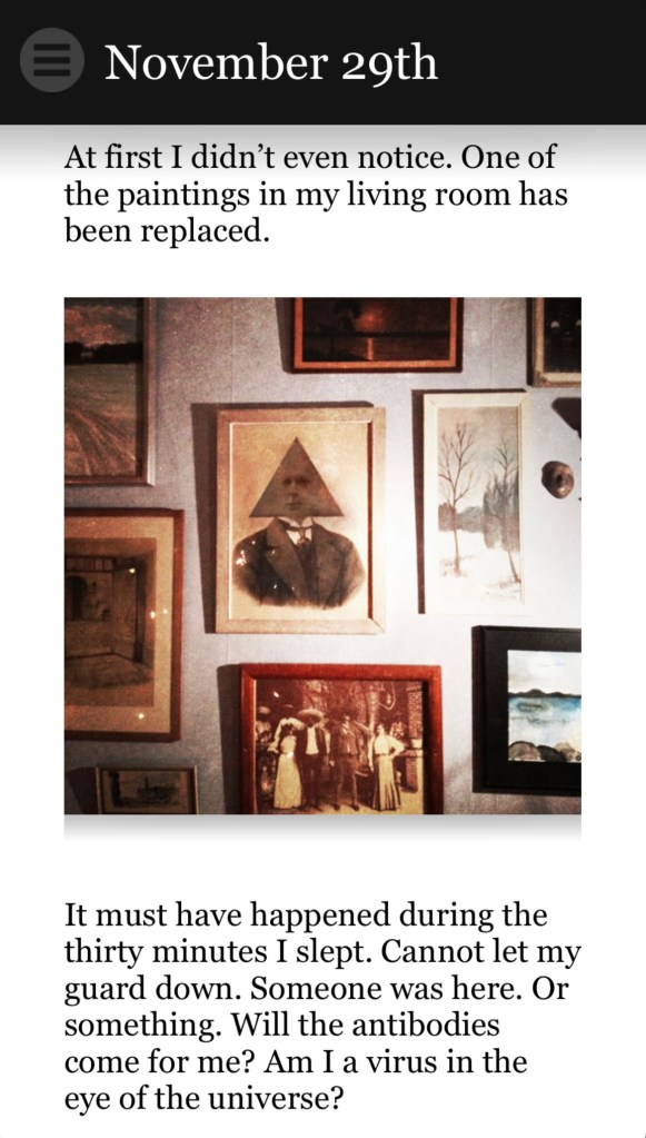 Learning about this succession of devices is the real story of DEVICE 6. Until close to the end, nothing much happens to Anna, really. But we grow more invested–more complicit–as we understand the nature of our interaction with the game. Of course, this is only as true as the facial scan at the beginning. But the fiction has overflowed its banks again, just like at the end of Year Walk, and this time the overflowing has been aided by real-life revelations that your phone is up to more than you know. Believing the impossible isn’t so hard.