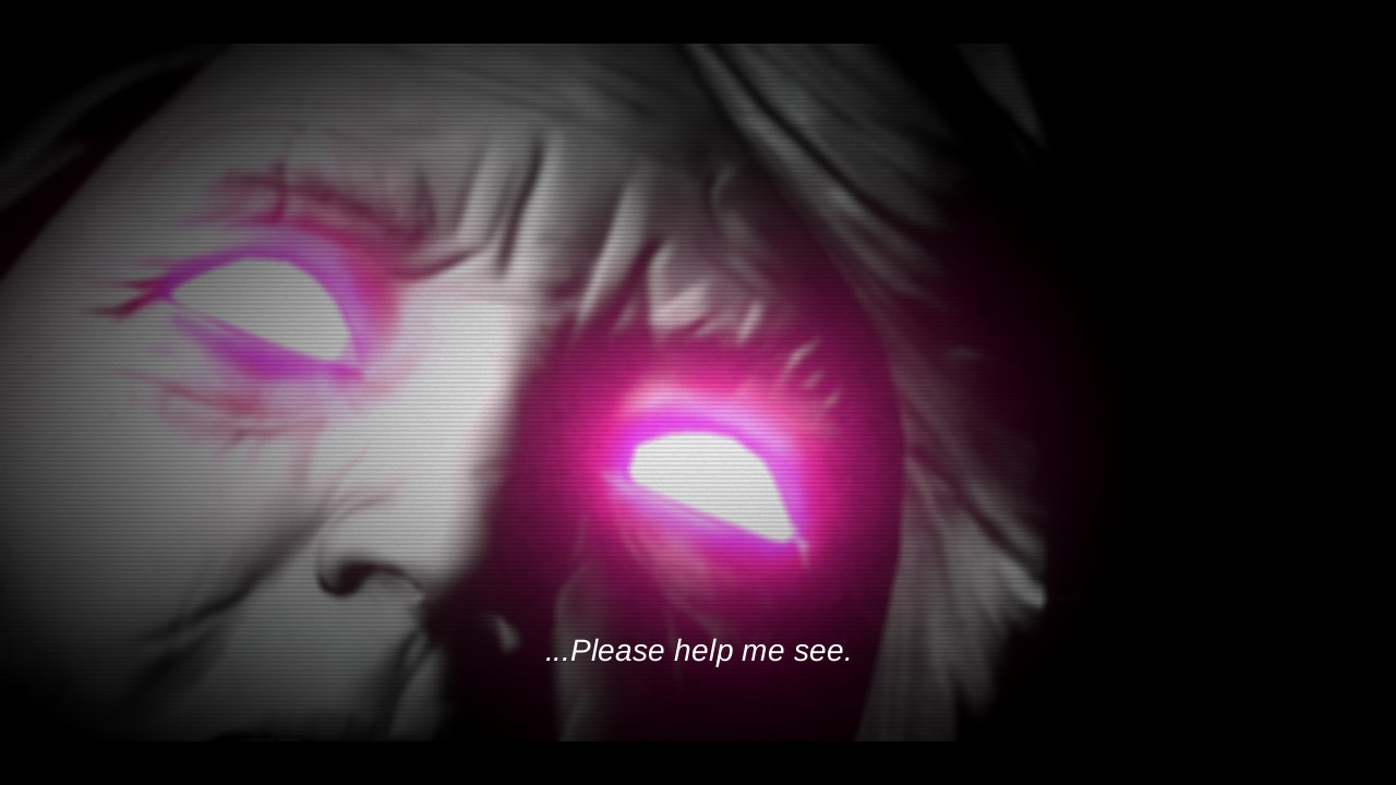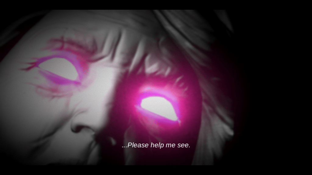 This old woman with glowing red eyes is Lorelei Weiss, our player character, decades later, ohne sunglasses. That fact is not immediately obvious: in my view, the narrative purpose of the player character’s sunglasses is to mask whether she has glowing red eyes or no eyes at all, i.e. whether she is actually Lorelei or Renate. Until close to the end, the game is very keen on allowing its characters to crisscross into each other’s identity space.