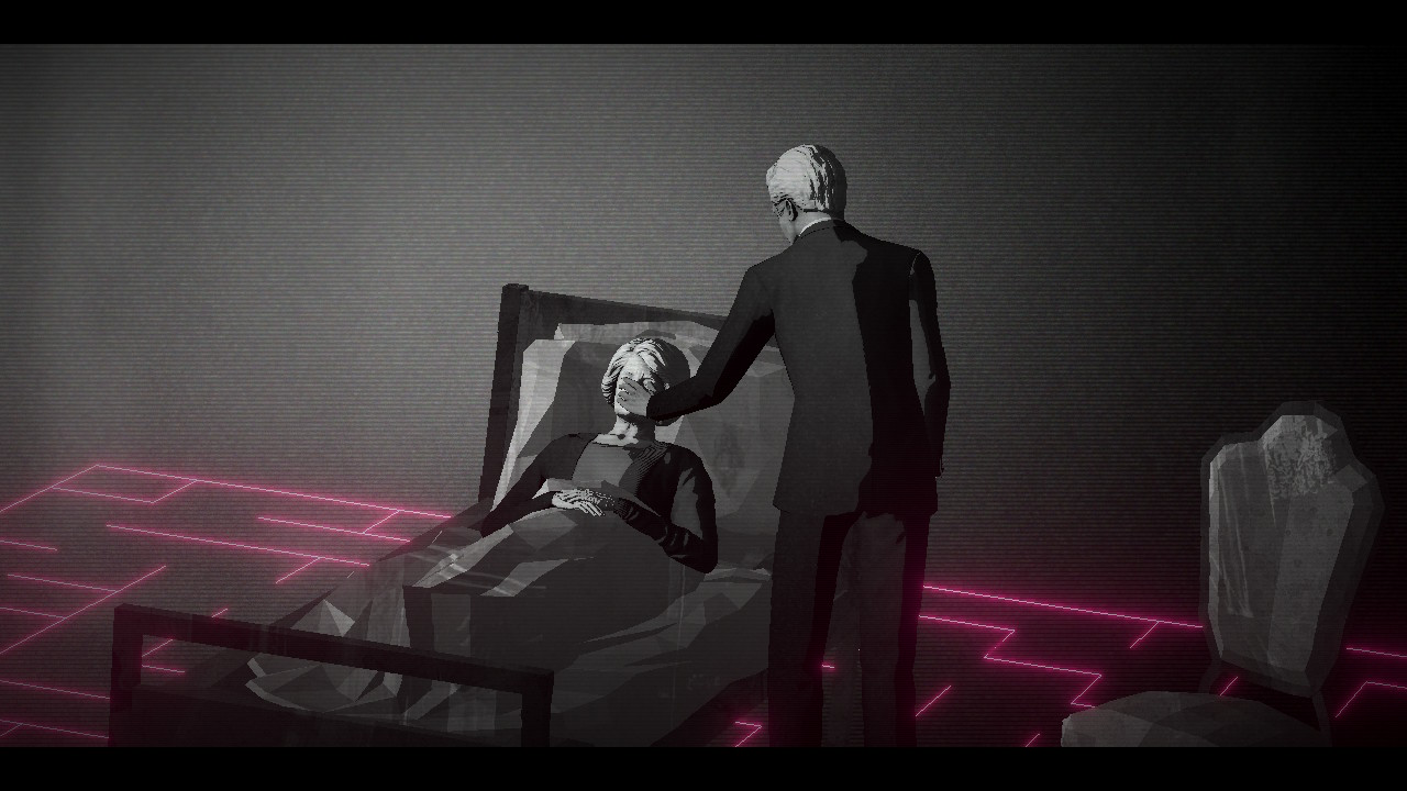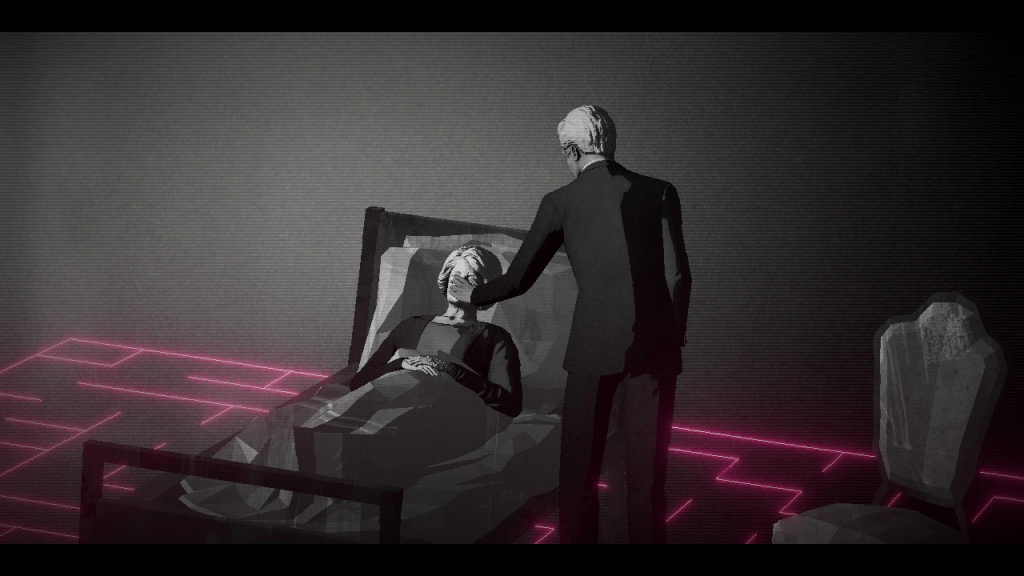 The woman’s name is Renate Schwarzwald, and she was ostensibly the owner of this estate before it became a hotel. Like our other characters, she is an artist: a portraitist whose eyes failed in later life, leading her to embrace abstraction–not unlike Sargy Mann. Schwarzwald’s late work gives Lorelei its most indelible image: a man in a black suit with a neon red maze for a head. Identity is a puzzle in this game. Faces are obscured by coy camera angles, blurry textures, and sunglasses. Schwarzwald’s maze man–a creative insight born from a lack of literal vision–hits the nail on the head.