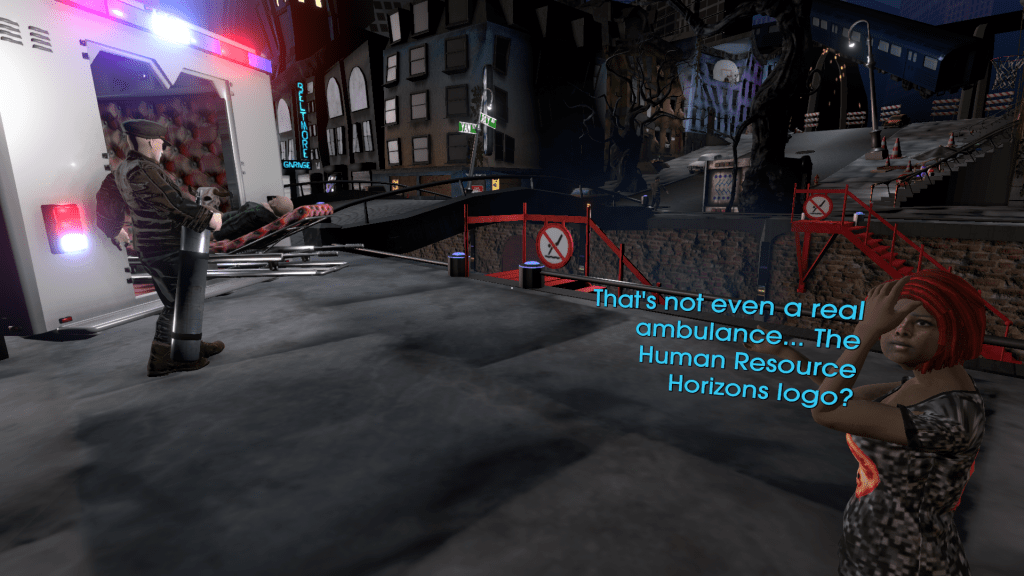 It’s a clean and decisive ending–possibly a disappointing one for those of us who appreciate ambiguity. “It was all in her head” is not the sort of ending a creative writing professor would sanction. But there’s more to it than that. At the end of my second playthrough, the facet of the ending that really hit home for me was Lorelei’s reconciliation with Renzo. Clearly, she feels guilty for her part in his death. And obviously her memories of Renzo are coloured by the fact that she knew him at his worst. But the image of Renzo that the game leaves us with is not of him with bloodied eye sockets, or even with his face cut off at the nose. Rather, we see him in full, looking youthful: a comforting presence for the dying Lorelei.
